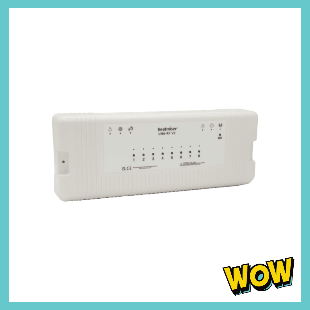 Receives signals from Heatmiser RF thermostats to manage actuators, boiler, and pump outputs. Compatible with Heatmiser neoAir and Slimline-RF.